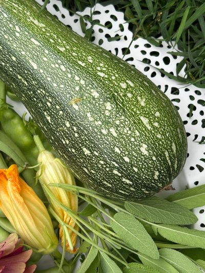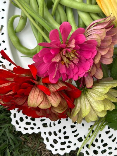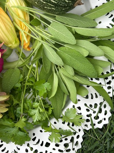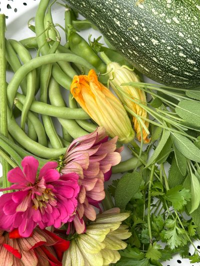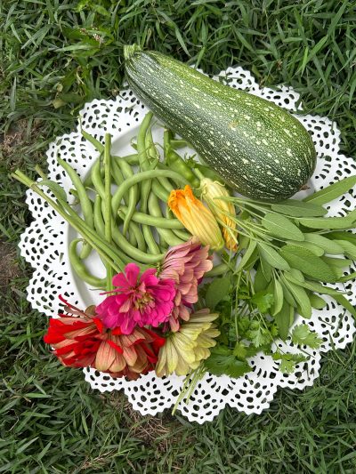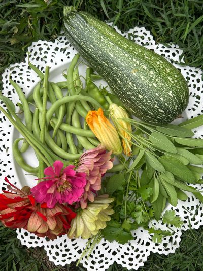 It included a zucchini, peas, green beans, sage, cilantro, zucchini flowers and some zinnias. I was so proud as a beginner gardener.